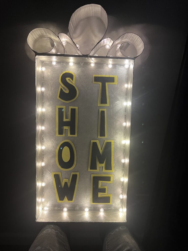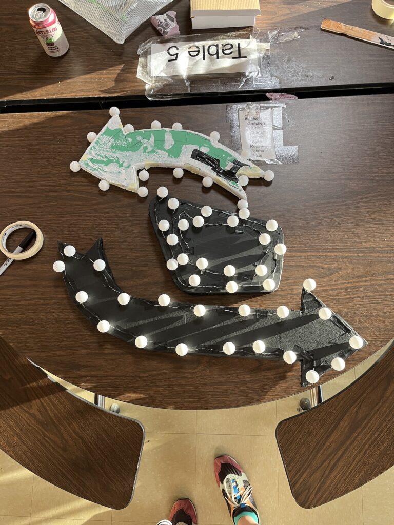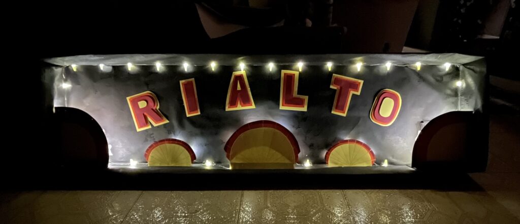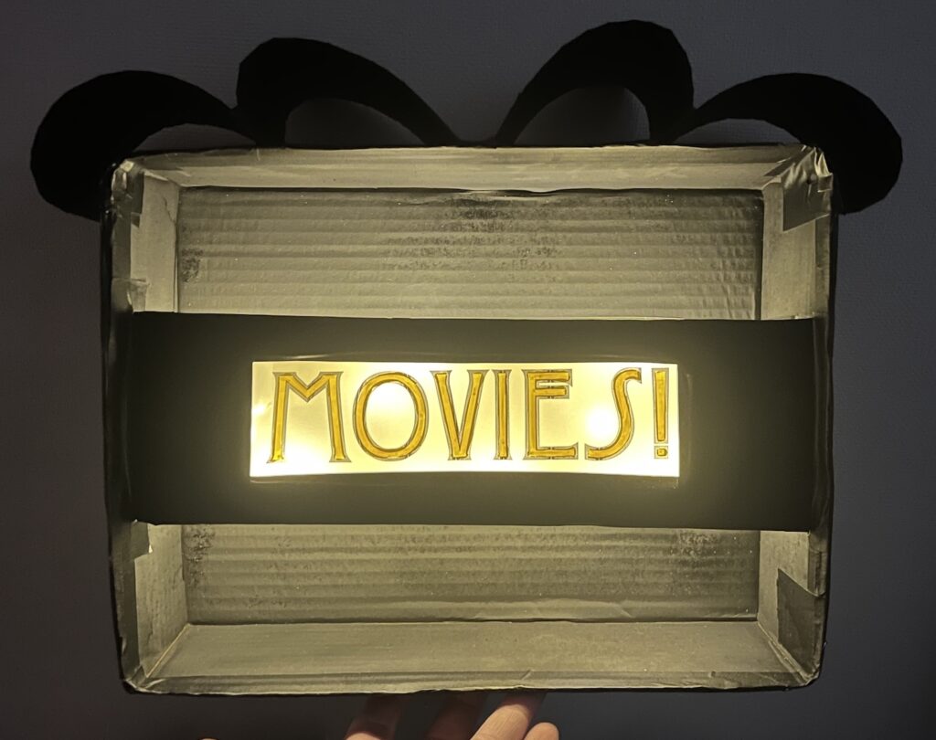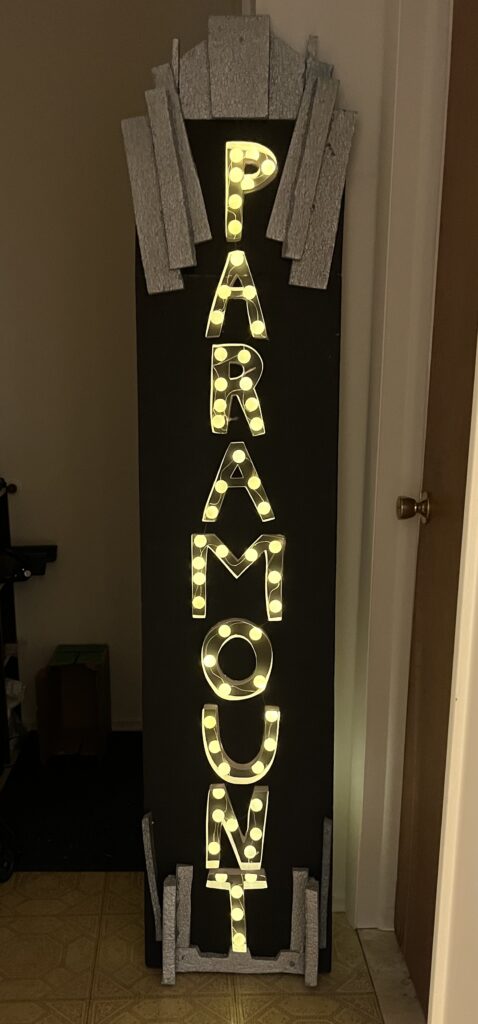 The flourishes on the Paramount sign were made with a dense packing foam, and those on the SHOW TIME sign were cardboard painted silver. The mini lights on the Rialto sign were tips of microfuge tubes salvaged from a lab and glued onto the fairy lights. The MOVIES! and Now Showing signs were both backlit with raised features built in. Arrow lights were carved and assembled by parent volunteers and one kiddo and adorned the lobby. “